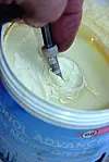 MODERNE SMØREFETT: Det lønner seg sterkt å sette inn alle gjenger med et moderne fett. Dette er et litiumfett for maritim bruk, og skruen tilhører foldepropellen.