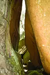 TRANGT: Det er småkupert rundt på øya. Denne passasjen er det mulig å klemme seg igjennom.