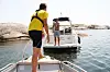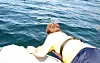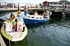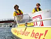 Jabob og Rune tar noen runder rundt båtene og bryggene der det er folk, på høflig avstand, men likevel nærme nok til at folk kan se hva som står på båten.