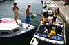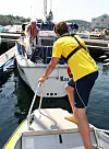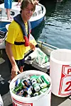 Fra Buster-båten «Panter'n» tar Jakob Palmers og Rune Sagvolden i mot båtfolkets tomgods i gjestehavner og uthavner i sommer.