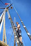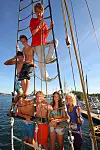 – Vi har nettopp tatt Båtførerprøven. Og besto! roper en gutt fra riggen på «Svanen», før han stuper seg ut i vannet fra ripa på den den nesten 100 år gamle skuta.
