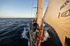 Forhåpentligvis klarer vi å komme gjennom overgangssonen mellom vinden offshore og sjøbrisen før de bak har kommet opp på siden av oss, men jeg tror det kan bli tett. I så flatt vann som vi seiler nå kan vi sende noen opp i riggen, og da kan vi se en annen båt minst 15 nautiske mil unna. Fra dekk kan vi se en annen båt circa 10 mil unna. I mørket varierer det.