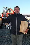STORT BILDE: Det drøyde lenge før hovedfeltet av båter nærmet seg mållinjeni Kabelvåg. De mange som hadde møtt frem for å se innkomsten benyttet finværet til å slappe av og sole seg. Her ser vi hvite seil begynner å nærme seg i det fjerne.FOTO TIL HØYRE: Anton Borch, Tromsø, med Vestfjordpokalen.