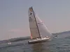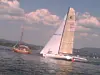 Camilla er en trimaran av typen SeaCart 30 R. Den lette og raske båten har plukket vind ved Nesodden, opplyser Seilas' reportasjebåt. Her går den nå ut fjorden i ca fem knops fart. Samtidig ligger de store båtene og driver lenger ut i fjorden. Ifølge vår reportasjebåt blåser det nå i et belte mellom Nesodden og Grimsøya, mens det er stille lenger ut.