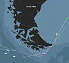 Det er røff sjø i området med 4-5 meters bølgehøyde. Vinden er på 25-30 knop med kast opp mot 40 knop.