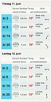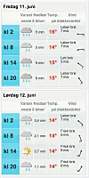 Yr.no melder om 6 mm regn kl 1400 fredag med 4 m/s fra sydøst. Kl 20.00 har vinden dreiet til sydvest med samme styrke. Regnet har økt til 7 mm i indre Oslofjord. På Filtvet er vindstyrken den samme, vinden dreier her fra øst til sør. Det er meldt om litt mindre nedbør.